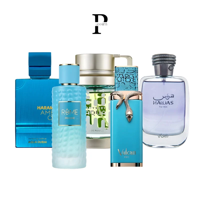 Incluye: Al Haramain Amber Oud Aqua Dubai, Rome Imagine, Odyssey Aqua (Armaf), Vulcan Feu (French Avenue) y Hawas For Him (Rasasi).
