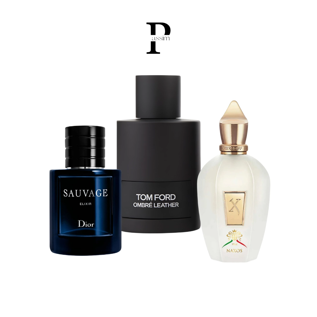 Incluye: Sauvage Elixir (Dior), Ombré Leather EDP (Tom Ford) y Naxos (Xerjoff).